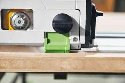 • Spring-loaded spacer wedge for unhindered plunge cuts and tool-less play setting on the guide rail.